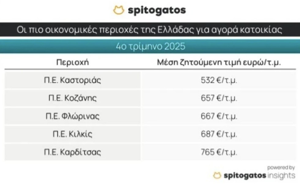 Αντίθετα, οι χαμηλότερες τιμές αγοράς καταγράφονται στην Π.Ε. Καστοριάς, με μέση ζητούμενη τιμή 532 ευρώ/τ.μ., ενώ ακολουθούν οι Π.Ε. Κοζάνης, Φλώρινας, Κιλκίς και Καρδίτσας.
