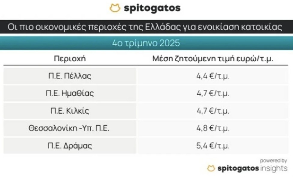 Αντίστοιχα η εικόνα διαμορφώνεται και στην αγορά ενοικίασης. Τα Νότια Προάστια διατηρούν την πρωτιά στις υψηλότερες τιμές, ενώ ακολουθούν τα Βόρεια Προάστια, ο Δήμος Αθηναίων, οι Κυκλάδες και ο Πειραιάς. Οι πιο οικονομικές επιλογές για ενοικίαση κατοικίας εντοπίζονται κυρίως στη Βόρεια Ελλάδα, με τις Π.Ε. Πέλλας, Ημαθίας, Κιλκίς και Δράμας να καταγράφουν τις χαμηλότερες μέσες ζητούμενες τιμές.