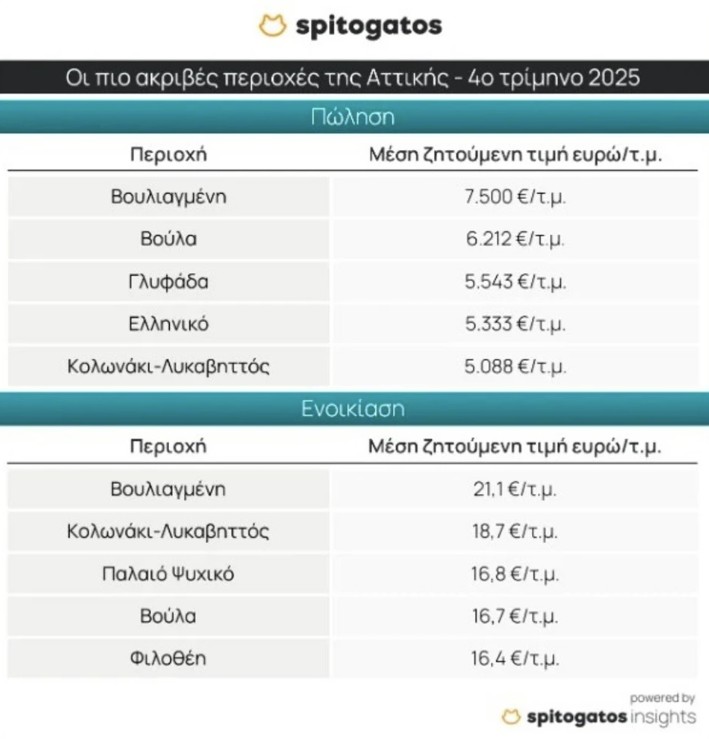 Στην Αττική, οι μέσες ζητούμενες τιμές πώλησης κατοικιών αυξήθηκαν κατά 8,1% σε ετήσια βάση, ενώ στην ενοικίαση η αντίστοιχη αύξηση διαμορφώθηκε στο 4,8%. Η Βουλιαγμένη παραμένει η ακριβότερη περιοχή για αγορά κατοικίας, με μέση ζητούμενη τιμή 7.500 ευρώ/τ.μ., παρά τη μικρή τριμηνιαία υποχώρηση. Ακολουθούν η Βούλα, η Γλυφάδα, το Ελληνικό και το Κολωνάκι-Λυκαβηττός, όπου οι αυξήσεις κινούνται σε πιο ήπιους ρυθμούς.