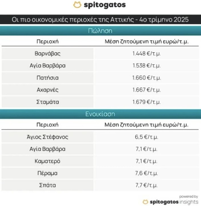 Στις πιο προσιτές περιοχές για αγορά κατοικίας στην Αττική συγκαταλέγονται ο Βαρνάβας, η Αγία Βαρβάρα, τα Πατήσια, οι Αχαρνές και η Σταμάτα. Στην ενοικίαση, η Βουλιαγμένη διατηρεί επίσης την πρώτη θέση με μέση ζητούμενη τιμή 21,1 ευρώ/τ.μ., ενώ χαμηλότερα ενοίκια καταγράφονται σε περιοχές όπως ο Άγιος Στέφανος, η Αγία Βαρβάρα, το Καματερό, το Πέραμα και τα Σπάτα.