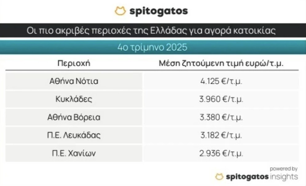 Σε πανελλαδικό επίπεδο, τα Νότια Προάστια παραμένουν η ακριβότερη περιοχή για αγορά κατοικίας, με μέση ζητούμενη τιμή 4.125 ευρώ ανά τετραγωνικό μέτρο. Ακολουθούν οι Κυκλάδες και τα Βόρεια Προάστια, ενώ την πρώτη πεντάδα συμπληρώνουν η Λευκάδα και τα Χανιά.