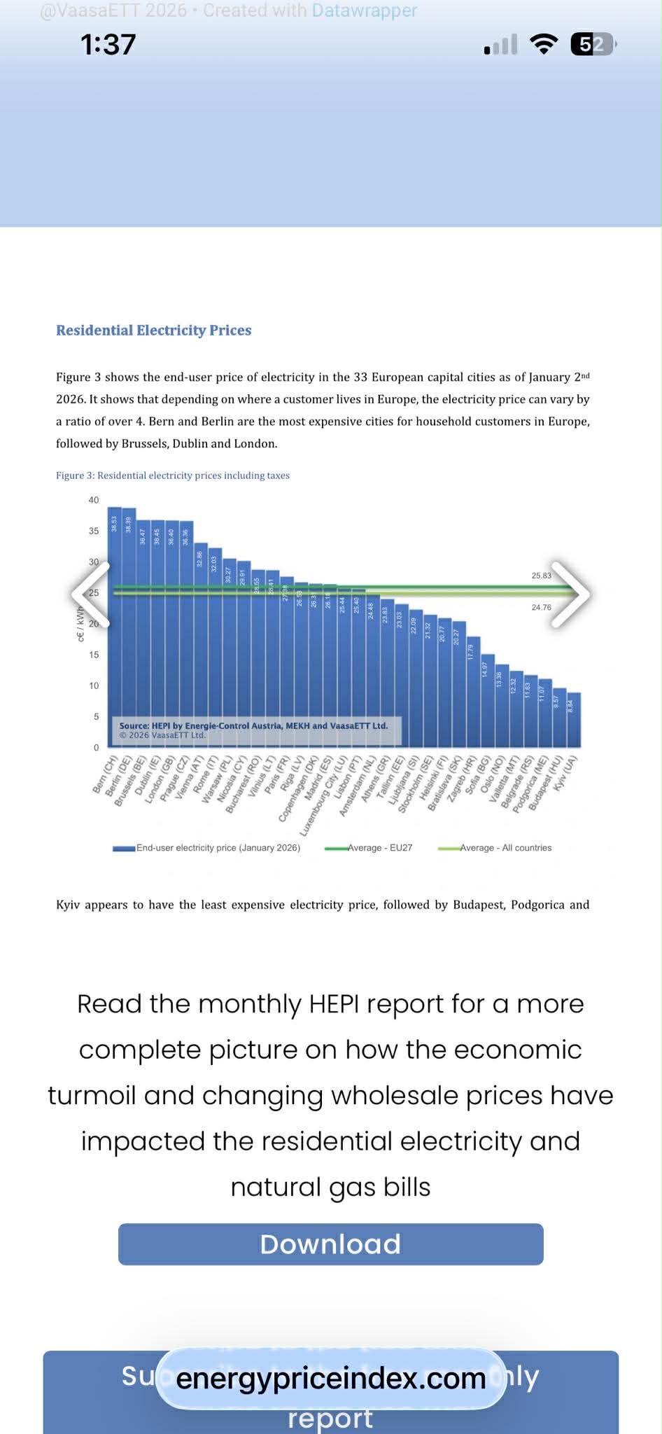 Στον αντίποδα, το Κίεβο εμφανίζει τη χαμηλότερη τιμή ηλεκτρικού ρεύματος, με τη Βουδαπέστη, την Ποντγκόριτσα και το Βελιγράδι να ακολουθούν.