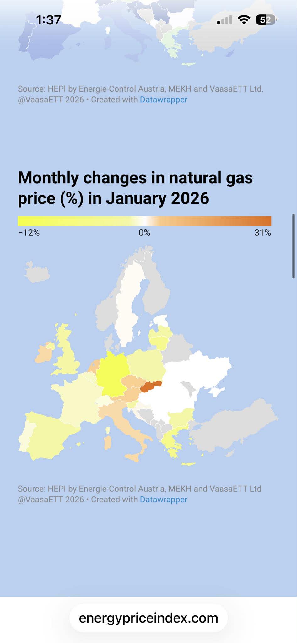 Τον Ιανουάριο, η μέση τελική τιμή φυσικού αερίου για τους οικιακούς καταναλωτές παρέμεινε σταθερή. Από τις 27 πρωτεύουσες που εξετάζονται, 6 κατέγραψαν αυξήσεις — με τη σημαντικότερη να σημειώνεται στη Μπρατισλάβα — ενώ μειώσεις παρατηρήθηκαν σε 10 αγορές. Στις υπόλοιπες 11 δεν καταγράφηκε μεταβολή.