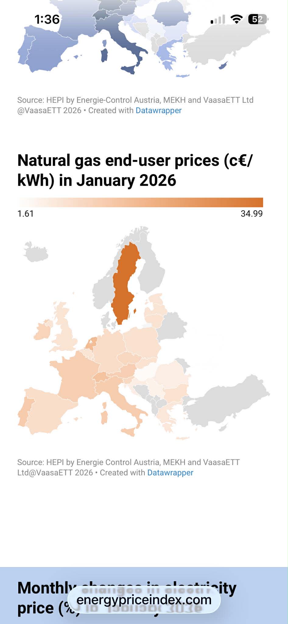 Η τιμή στη Στοκχόλμη είναι πάνω από 13 φορές υψηλότερη σε σύγκριση με τη Βουδαπέστη, που αποτελεί τη φθηνότερη πόλη για φυσικό αέριο στην Ευρωπαϊκή Ένωση, και σχεδόν 22 φορές υψηλότερη σε σχέση με το Κίεβο.