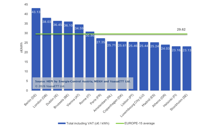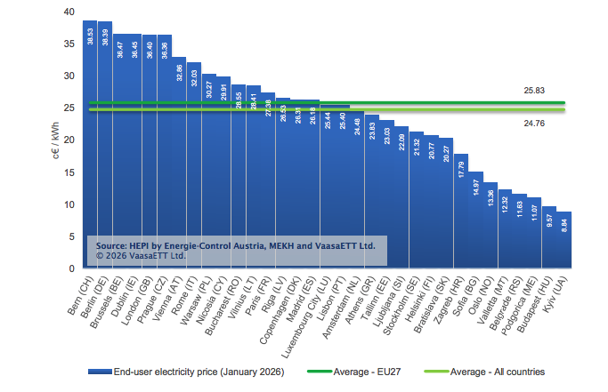 Τον Ιανουάριο του 2026, το Βουκουρέστι, η Πράγα, η Ρίγα, το Βίλνιους και η Βαρσοβία ήταν οι μόνες πρωτεύουσες των χωρών της CEE στις οποίες η τιμή ηλεκτρικής ενέργειας διαμορφώθηκε πάνω από τον ευρωπαϊκό μέσο όρο.
