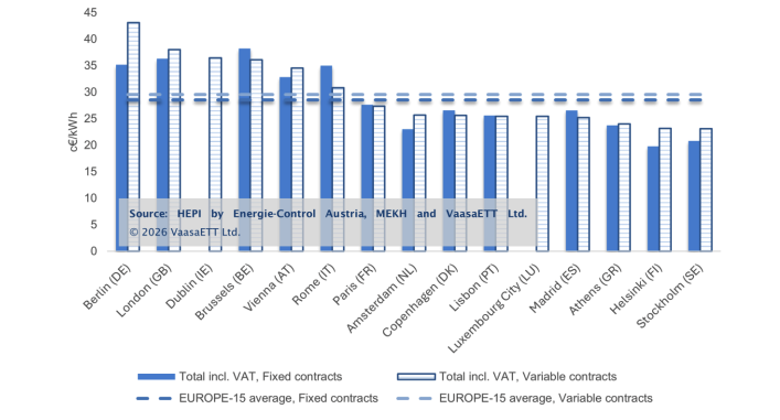 Τον Ιανουάριο του 2026 παρατηρείται αύξηση στον αριθμό των διαθέσιμων σταθερών συμβολαίων, ενώ η μέση τιμή τους είναι χαμηλότερη από τη μέση τιμή των κυμαινόμενων κατά 1,05 λεπτά του ευρώ ανά κιλοβατώρα (c€/kWh). Σε επτά από τις αγορές της ομάδας EUR-15, όταν εξετάζονται μεμονωμένα, τα σταθερά τιμολόγια είναι κατά μέσο όρο φθηνότερα από τα κυμαινόμενα — συγκεκριμένα στην Αθήνα, το Άμστερνταμ, το Βερολίνο, το Ελσίνκι, το Λονδίνο, τη Στοκχόλμη και τη Βιέννη.