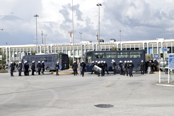 Οι συμμετέχοντες, στην κινητοποίηση που ξεκίνησαν από το Παγκρήτιο Στάδιο με μηχανοκίνητη πορεία, είχαν στόχο να πλησιάσουν στο Αεροδρόμιο Ηρακλείου, ωστόσο ισχυρές αστυνομικές δυνάμεις είχαν αποκλείσει το πέρασμα προς τον αερολιμένα και από την Λεωφόρο Σενετάκη, αλλά και από την Λεωφόρο Ικάρου. Στην επιμονή των συγκεντρωμένων να πλησιάσουν πιο κοντά στο Αεροδρόμιο Ηράκλειου, ξεκίνησαν μικροσυμπλοκές, με πετροπόλεμο και χρήση χημικών και κρότου – λάμψης.