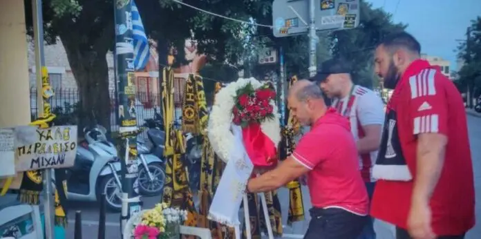 Οι φίλοι του Ολυμπιακού άφησαν στεφάνι στη μνήμη του δολοφονημένου οπαδού της ΑΕΚ, Μιχάλη Κατσούρη, ως ένδειξη τιμής.