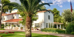 H πολυτελής κατοικία περιβάλλεται από περιποιημένους κήπους, μια πισίνα και μεγάλες βεράντες.
