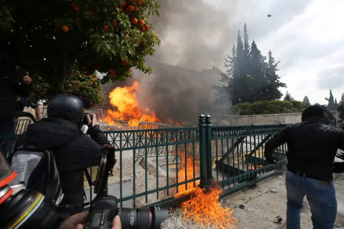 Επεισόδια βρίσκονται σε εξέλιξη στο κέντρο της Αθήνας, καθώς κουκουλοφόροι πετάνε μολότοφ στη Βουλή.