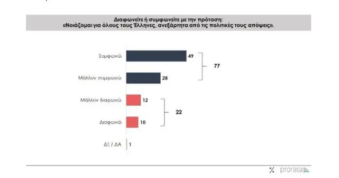Σχεδόν 4 στους 5 Έλληνες νοιάζονται για τους συμπατριώτες τους ανεξαρτήτως πολιτικών πεποιθήσεων ενώ εάν η χώρα δεχόταν στρατιωτική επίθεση, το 72% θα έμενε να πολεμήσει, σύμφωνα με τα ευρήματα της νέας έρευνας της Prorata.
