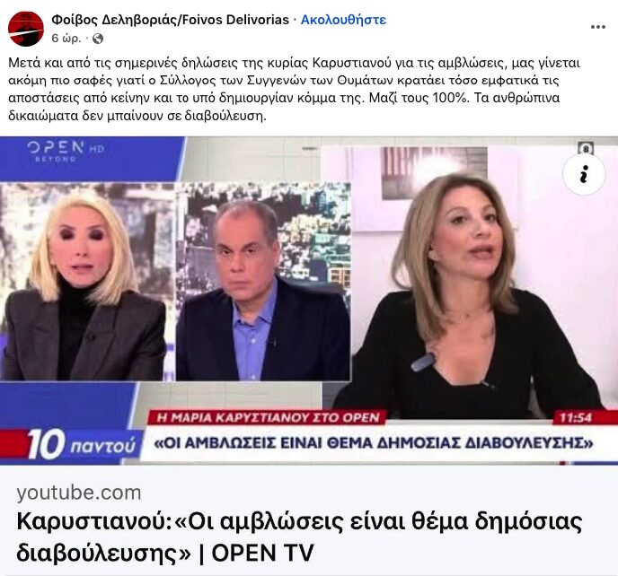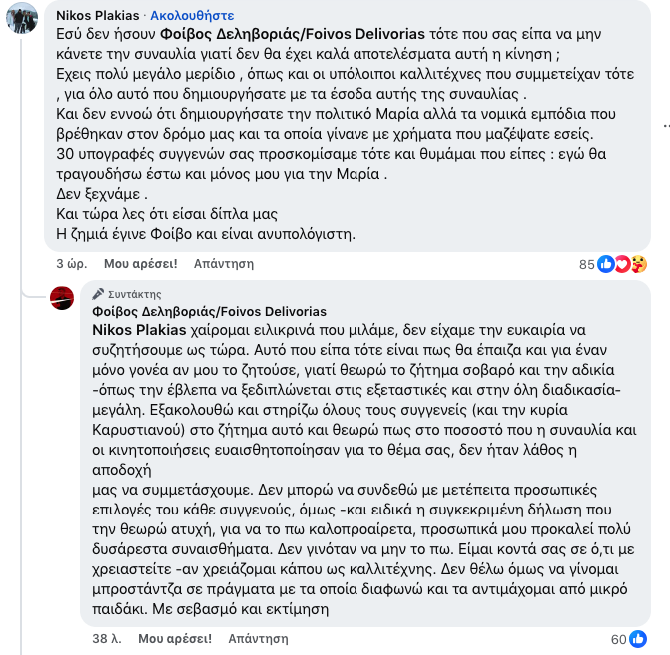Ο πατέρας των δίδυμων κοριτσιών που έχασαν τη ζωή τους στο σιδηροδρομικό δυστύχημα των Τεμπών, απαντώντας κάτω από την ανάρτηση του Φοίβου Δεληβοριά με την οποία καταδίκαζε τη θέση Καρυστιανού για τις αμβλώσεις, έκανε λόγο για «νομικά εμπόδια» που προέκυψαν μετά τη συναυλία στο Καλλιμάρμαρο, υποστηρίζοντας ότι αυτά συνδέονται άμεσα με τη διαχείριση των εσόδων της εκδήλωσης.