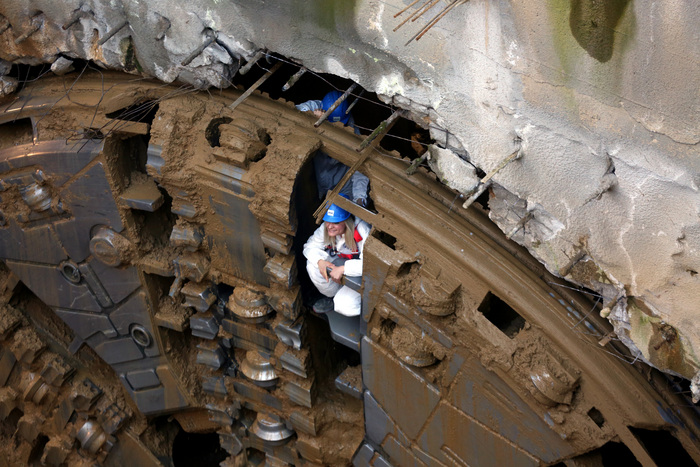 Το «ξετρύπημα» αυτό του πρώτου από τους δύο μετροπόντικες που δουλεύουν για το μεγαλύτερο δημόσιο έργο της χώρας, είναι το ορόσημο της θραύσης του τοιχίου του φρέατος, στη γλώσσα του κατασκευαστικού κλάδου ονομάζεται breakthrough (μπρέικθρου).