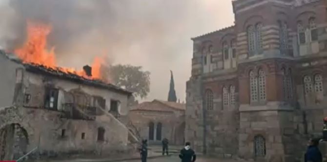 Η πυρκαγιά στο πέρασμά της έχει κάψει ολοσχερώς τον περίβολο του ιστορικού μοναστηριού. Οι πρώτες φλόγες έφτασαν στο εσωτερικό της Μονής και καίνε ένα από τα παλαιότερα κτίρια.