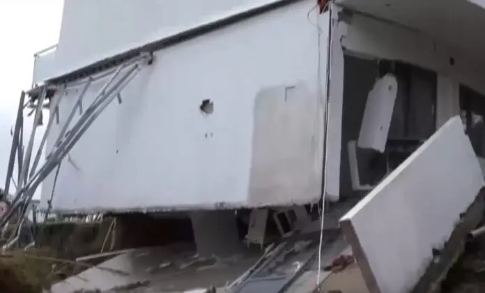 Το ξενοδοχείο φαίνεται να «κρέμεται» ουσιαστικά στον αέρα, καθώς τα ορμητικά νερά από το ρέμα που βρίσκεται εκεί, παρέσυραν το υπέδαφος στο οποίο ήταν στερεωμένο, όπως και τα θεμέλια του κτιρίου, με αποτέλεσμα αυτό να γείρει.