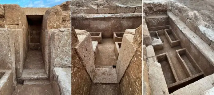Στον κυρίως θάλαμο εντοπίστηκαν μια μονολιθική σαρκοφάγος και άλλες πέντε ορθογώνιες κτιστές θήκες περιμετρικά των τοίχων: Σε δύο τάφους οι καλυπτήριες πλάκες βρέθηκαν εμφανώς παραβιασμένες, ενώ στους υπόλοιπους δεν εντοπίστηκε κάλυψη. Από το σύνολο των έξι τάφων, μόνον στη σαρκοφάγο διατηρούνταν σε ανατομική θέση η ταφή ενός ενήλικου ατόμου, πιθανότατα γυναίκας, ενώ στους υπόλοιπους τάφους το ανθρωπολογικό υλικό βρέθηκε διαταραγμένο. Αξιοσημείωτο είναι ότι εντός της σαρκοφάγου εντοπίστηκε μεγάλος αριθμός ζωικών οστών από μεγάλα και μικρά οικόσιτα ζώα και μεταξύ αυτών κέλυφος χελώνας.