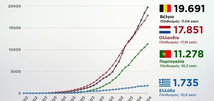 Παράλληλα, την θετική πορεία της χώρας αλλά και την αποτελεσματικότητα των μέτρων καταγράφουν δύο γραφήματα που δείχνουν την καμπύλη αύξησης κρουσμάτων και θυμάτων του κορωνοϊού στην Ελλάδα συγκριτικά με τρεις άλλες χώρες, με παρόμοιο πληθυσμό. Συγκεκριμένα, τα γραφήματα δείχνουν τη σύγκριση με Ολλανδία, Βέλγιο και Πορτογαλία το διάστημα από τις 26 Φεβρουαρίου έως και τις 5 Απριλίου.