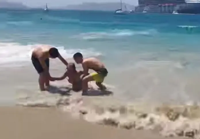 Σύμφωνα με την ανακοίνωση του λιμενικού και τις μαρτυρίες λουόμενων που ήταν εκείνη τη στιγμή στην παραλία, το μεγάλο κύμα παρέσυρε δύο λουόμενους, οι οποίοι τραυματίστηκαν.