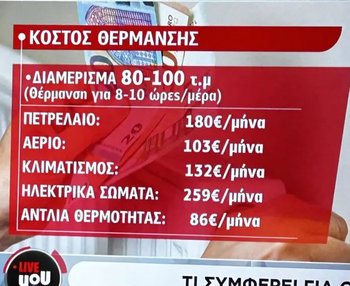 «Ας δούμε το κόστος ανά πηγή θέρμανσης για ένα τυπικό νοικοκυριό, π.χ. για ένα διαμέρισμα μέτριας μόνωσης 80τ.μ. με 100 τ.μ. στο λεκανοπέδιο Αθηνών, που λειτουργεί το σύστημα θέρμανσης 8 με 10 ώρες ημερησίως και με ρυθμισμένη την θερμοκρασία χώρου στους 20℃.