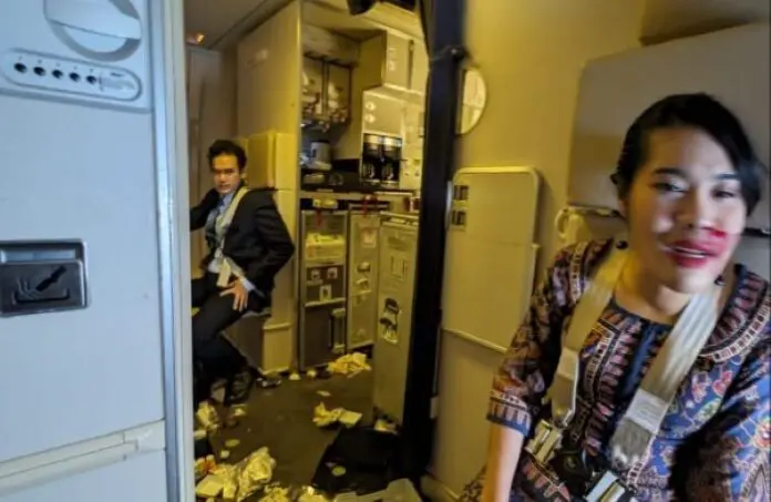 H στιγμή που μια αεροσυνοδός πετάχτηκε στο ταβάνι του αεροπλάνου μετά από τις αναταράξεις