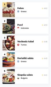 Ο μεν ντάκος με άριστα το 5 συγκέντρωσε 4,62, η δε χωριάτικη 4,43. Στη δεύτερη θέση βρίσκουμε την Pecel από την Ινδονησία, στην 3η την Mechouia από την Τυνησία και στην 5η την Shopska από τη Βουλγαρία, η οποία μοιάζει αρκετά με τη χωριάτικη, αφού περιέχει ντομάτα, αγγούρι, κρεμμύδι, αλλά και ψητές κόκκινες πιπεριές και τριμμένο τυρί.