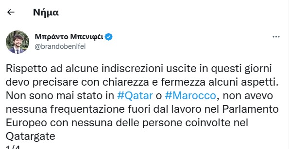 «Σε σχέση με ορισμένες φήμες στον Τύπο, πρέπει να ξεκαθαρίσω κάποιες πτυχές με σαφήνεια και αποφασιστικότητα. Δεν έχω πάει ποτέ στο Κατάρ ή στο Μαρόκο, δεν είχα καμία γνωριμία εκτός δουλειάς στο Ευρωπαϊκό Κοινοβούλιο με κανένα από τα άτομα που εμπλέκονται στο σκάνδαλο του Qatar Gate. Kάθε ερώτηση μου ή ψήφος ήταν πάντα αντίθετη με τις πολιτικές θέσεις για τα επίμαχα ζητήματα που επιδίωκαν αυτοί οι πολιτικοί».