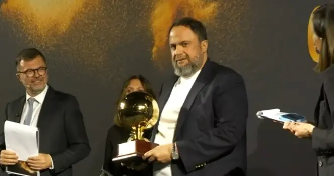 Ο Βαγγέλης Μαρινάκης σε μία μεγάλη βραδιά του ευρωπαϊκού ποδοσφαίρου παρέλαβε το βραβείο του με το «European Golden Boy Career Award» ως αναγνώριση της αφοσίωσής του στον Ολυμπιακό, που κορυφώθηκε το 2024 με τις κατακτήσεις του Conference League και, κυρίως, του Youth League.