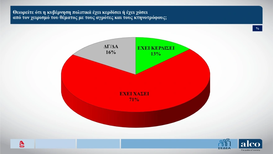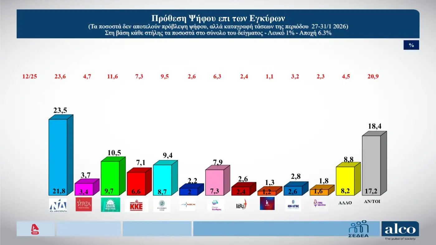 Η Νέα Δημοκρατία προηγείται με 13 μονάδες διαφορά του ΠΑΣΟΚ στην πρόθεση ψήφου σύμφωνα με τη δημοσκόπηση της Alco για το κεντρικό δελτίο ειδήσεων του Alpha.