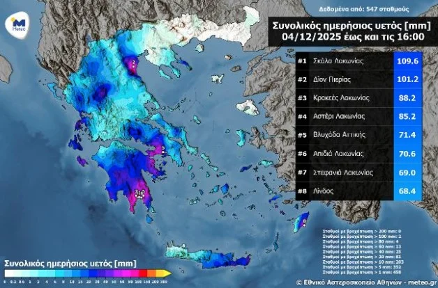 Το μεγαλύτερο ύψος βροχής μέχρι και τις 16:00 σημειώθηκε στη Σκάλα Λακωνίας με 109.6 mm, ενώ ακολούθησε το Δίον Πιερίας με 101.2 mm.