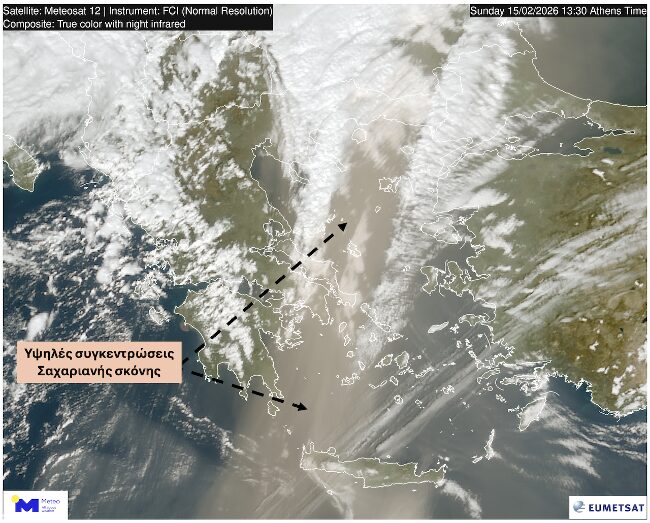 Υψηλές συγκεντρώσεις σαχαριανής σκόνης καταγράφονται σε μεγάλο μέρος της χώρας σήμερα το μεσημέρι, Κυριακή 15 Φεβρουαρίου.