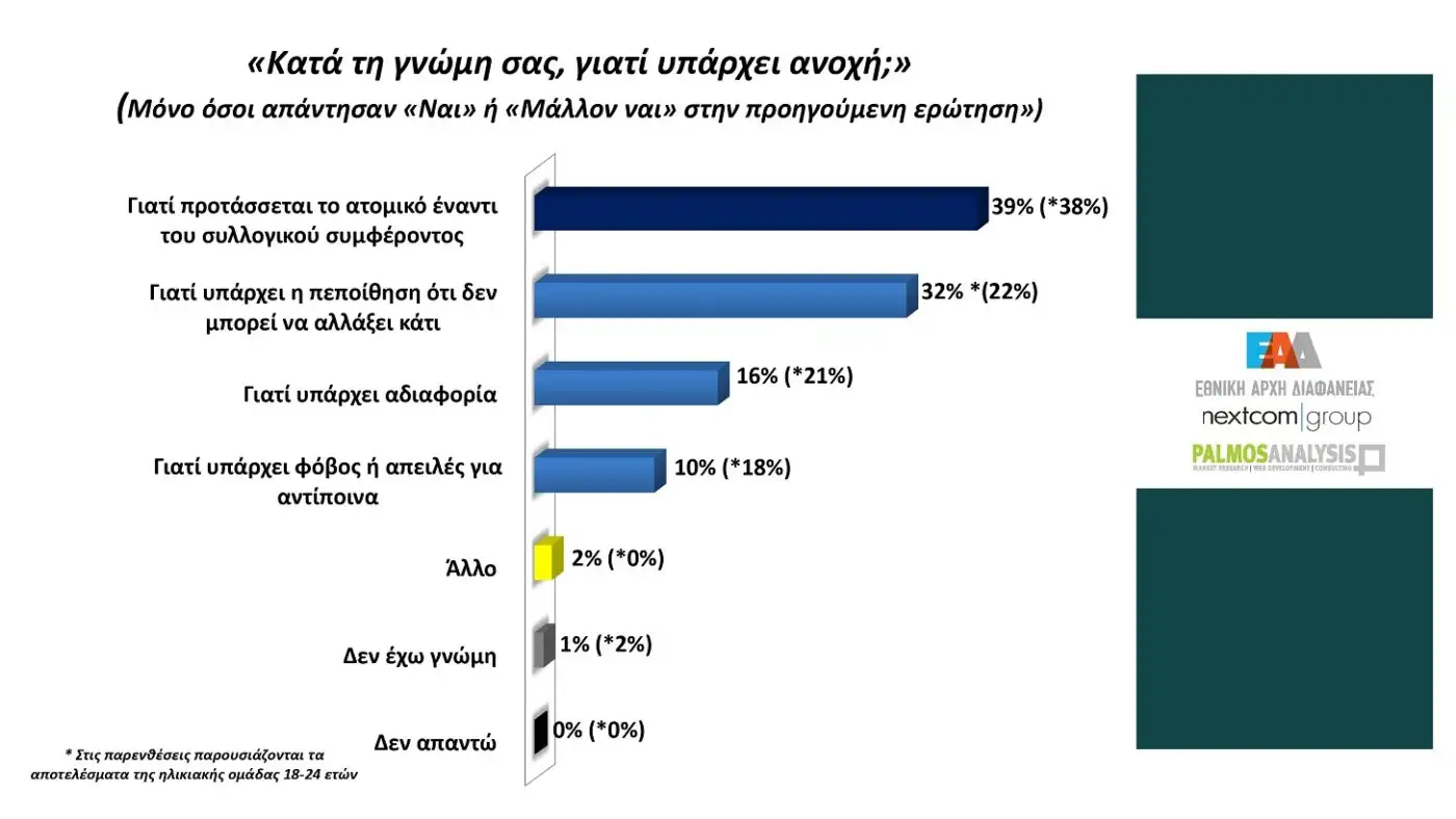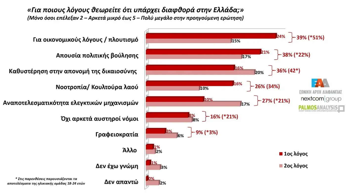 Στις ηλικίες 18-24 ετών κυριαρχεί με 51% για οικονομικούς λόγους/πλουτισμό, 42% λέει καθυστέρηση στην απονομή δικαιοσύνης, ένα 34% λέει νοοτροπία/κουλτούρα λαού και το 22% λέει απουσία πολιτικής βούλησης.