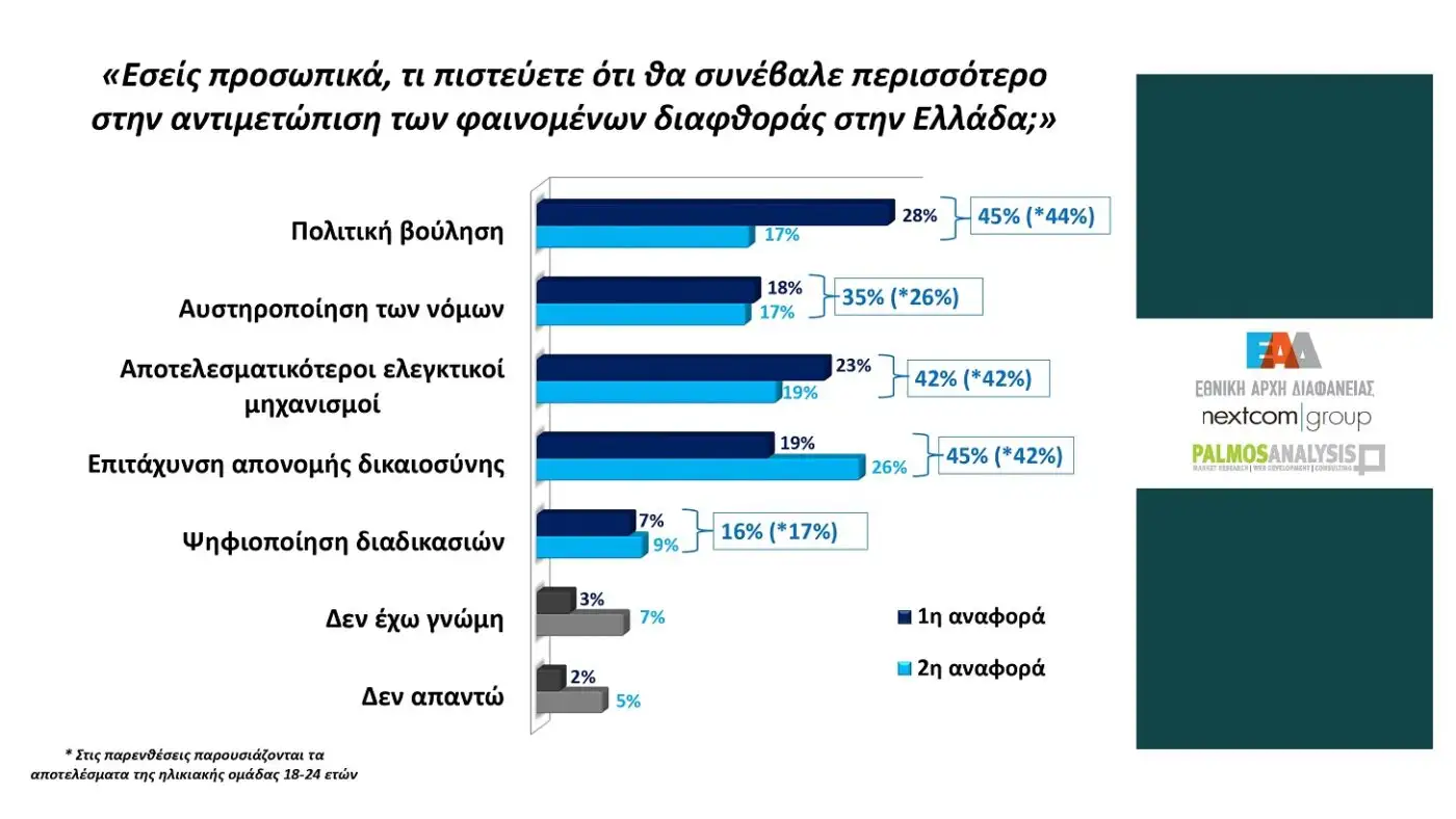 Στο ερώτημα τι θα συνέβαλε περισσότερο στην αντιμετώπιση φαινομένων διαφθοράς στην Ελλάδα οι απαντήσεις είναι οι εξής:
