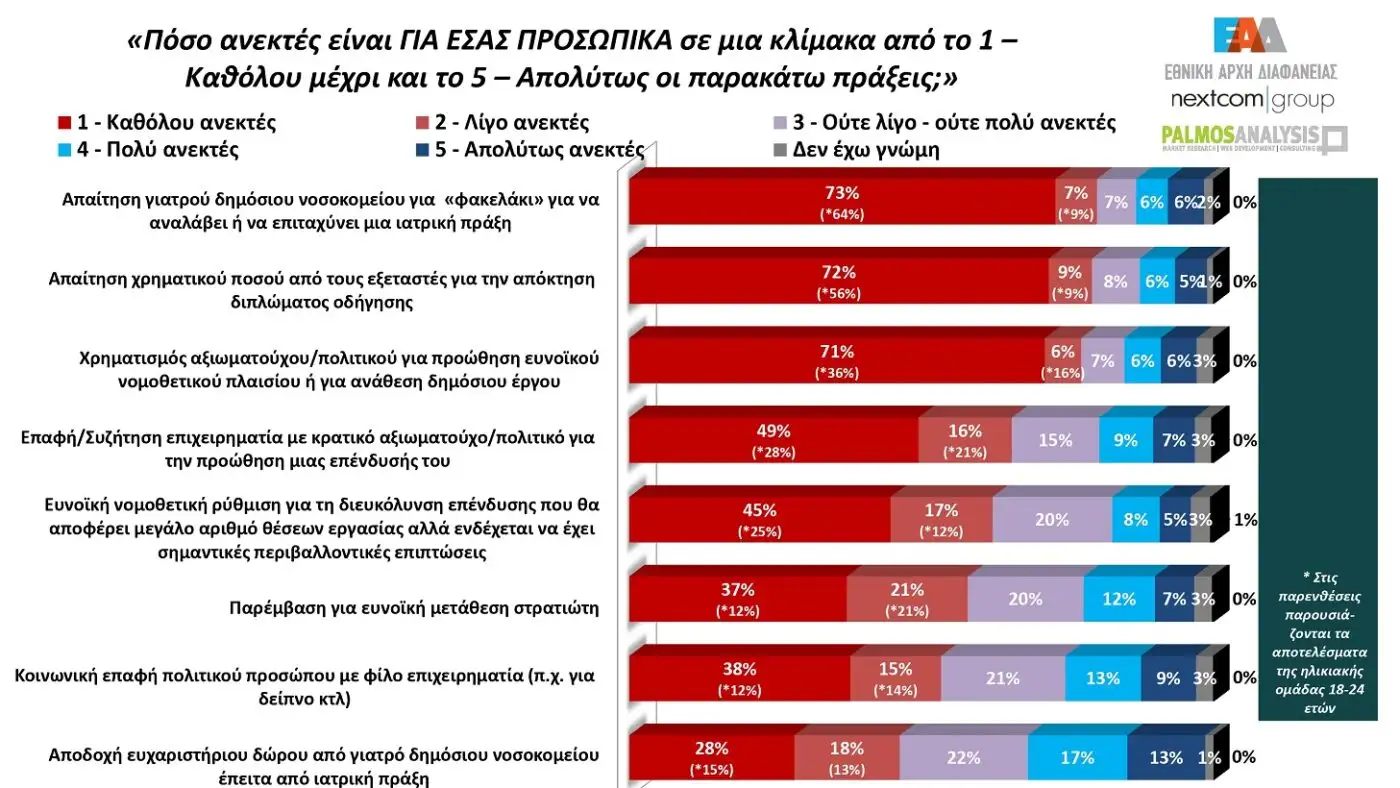 Στην ερώτηση για το πόσο ανεκτές είναι οι παρακάτω πράξεις καθόλου ανεκτή σε ποσοστό 73% είναι το «φακελάκι» σε γιατρό, σε 72% χρηματισμός για δίπλωμα οδήγησης, 71% χρηματισμός πολιτικού ή αξιωματούχου για ανάθεση δημοσίου έργου ή προώθηση ευνοϊκού νομοθετικού πλαισίου.