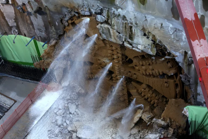 Το «ξετρύπημα» αυτό του πρώτου από τους δύο μετροπόντικες που δουλεύουν για το μεγαλύτερο δημόσιο έργο της χώρας, είναι το ορόσημο της θραύσης του τοιχίου του φρέατος, στη γλώσσα του κατασκευαστικού κλάδου ονομάζεται breakthrough (μπρέικθρου).