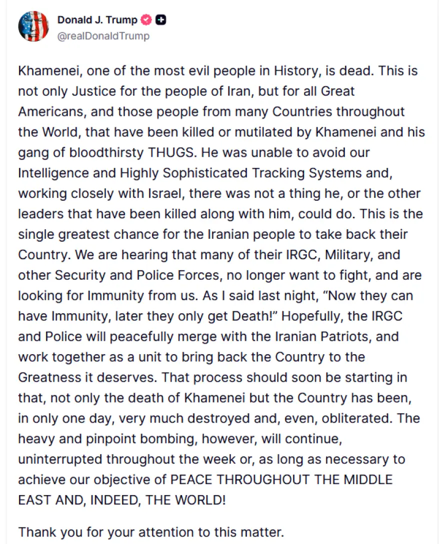 Σύμφωνα με τον Τραμπ, ο Χαμενεΐ εντοπίστηκε σε συνεργασία με το Ισραήλ μέσω «εξαιρετικά εξελιγμένων συστημάτων πληροφοριών». Στόχος της επιχείρησης είναι η αλλαγή καθεστώτος. Όπως είπε, είναι «η μεγαλύτερη ευκαιρία για τον ιρανικό λαό να πάρει πίσω τη χώρα του». Πρόσθεσε ότι δυνάμεις των Φρουρών της Επανάστασης και των σωμάτων ασφαλείας «δεν θέλουν πλέον να πολεμήσουν». Παράλληλα, ισραηλινοί αξιωματούχοι ανέφεραν ότι η σορός του ανακτήθηκε.