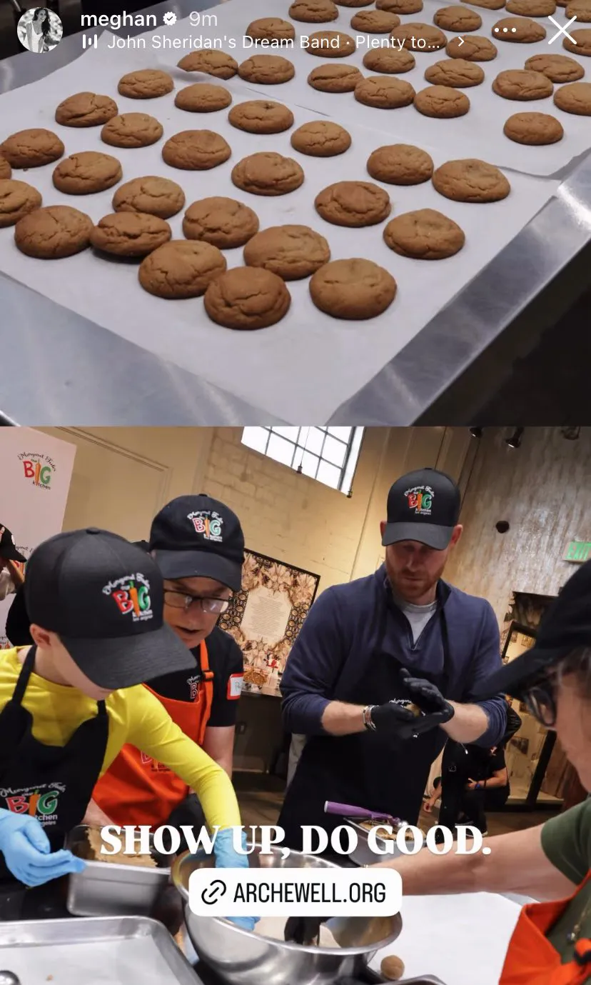 Φωτογραφίες από τη δράση δείχνουν τον Άρτσι και τη Λίλι να συμμετέχουν στη γραμμή συσκευασίας μαζί με τους γονείς τους, πλάθοντας μπαλάκια ζύμης. Η Μέγκαν, 44 ετών, παρουσίασε το τελικό αποτέλεσμα στα Instagram Stories, συνοδεύοντας τη φωτογραφία με τη λεζάντα: «Show up, do good».