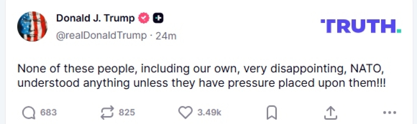 Ευθεία επίθεση κατά του ΝΑΤΟ εξαπέλυσε ο Αμερικανός πρόεδρος Ντόναλντ Τραμπ, με ανάρτησή του στο Truth Social.«Δυστυχώς, κανένας, ούτε οι δικοί μας, ούτε το ΝΑΤΟ, δεν φαίνεται να καταλαβαίνει την κατάσταση αν δεν του ασκηθεί ισχυρή πίεση!!!», έγραψε στην πλατφόρμα του.