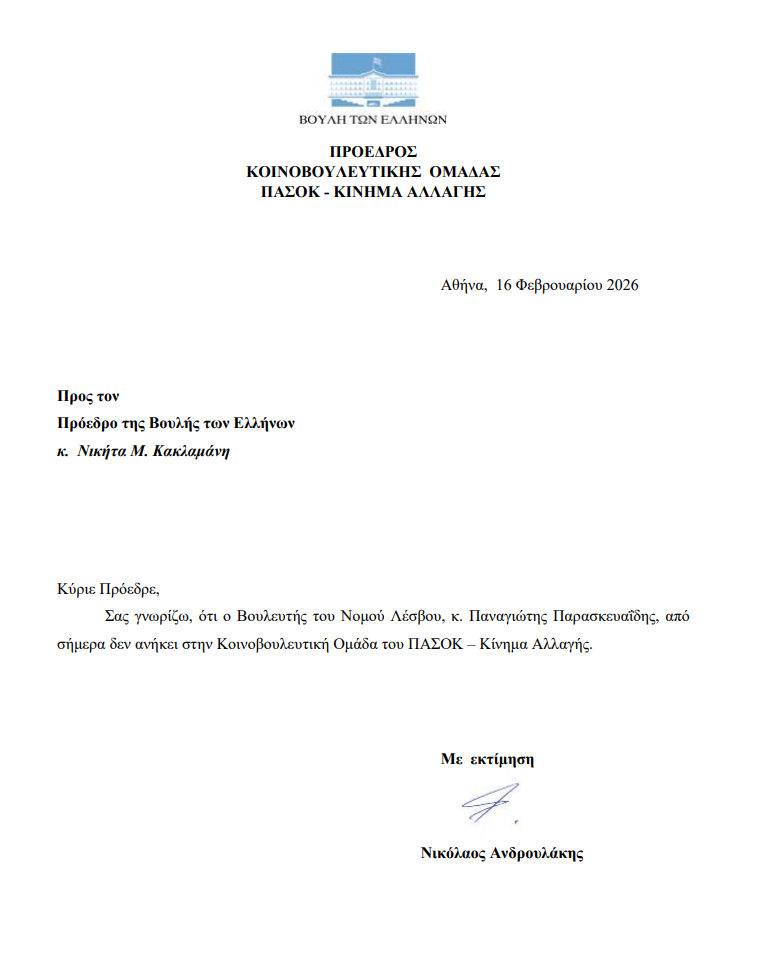 Η ανακοίνωση του ΠΑΣΟΚ: Οι συνεχείς απαράδεκτες δηλώσεις του βουλευτή Λέσβου, κ. Παρασκευαΐδη θολώνουν το πολιτικό και ιδεολογικό μήνυμα του ΠΑΣΟΚ και δεν μπορούν να είναι ανεκτές. Με επιστολή του στον Πρόεδρο της Βουλής, ο Νίκος Ανδρουλάκης γνωστοποιεί οτι ο κ. Παρασκευαΐδης τίθεται εκτός της Κοινοβουλευτικής Ομάδας του ΠΑΣΟΚ-Κινήματος Αλλαγής.