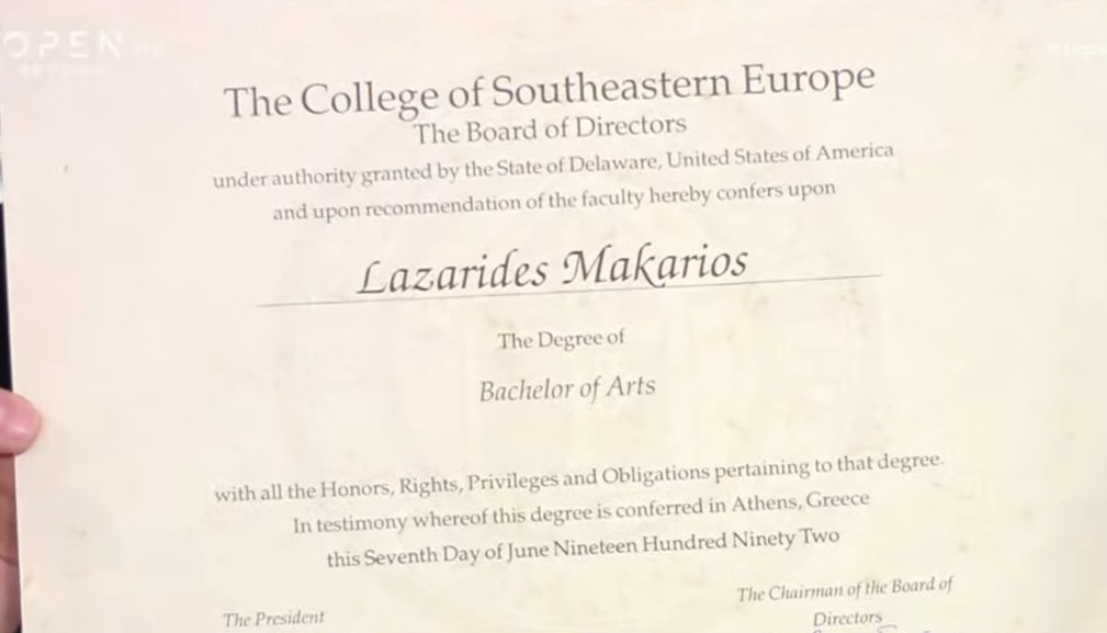 Ο Μακάριος Λαζαρίδης έδειξε το πτυχίο που είχε πάρει το 1992 από το συγκεκριμένο κολλέγιο και είπε: «Το 2007, μπορούσες να εργαστείς ως μετακλητός υπάλληλος ακόμα και με αυτή την βεβαίωση σπουδών παρά το γεγονός ότι δεν ήταν αναγνωρισμένο πτυχίο». Και πρόσθεσε: «Αυτό συνέβαινε γιατί οι μετακλητοί υπάλληλοι διορίζονται με πολιτική επιλογή του υπουργού και του γ.γ. και δεν περνούν από ΑΣΕΠ».