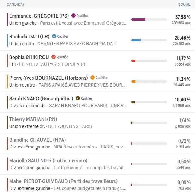 Ο Γκρεγκουάρ, επικεφαλής μιας ευρύτερης συμμαχίας της Αριστεράς που περιλαμβάνει τους Πράσινους και τους Κομμουνιστές, συγκέντρωσε περίπου 38% των ψήφων, καταγράφοντας σημαντικό προβάδισμα έναντι της συντηρητικής υποψηφίας Ρασιντά Ντατί του Ρεπουμπλικανικού κόμματος, η οποία περιορίστηκε στο 25,46%.