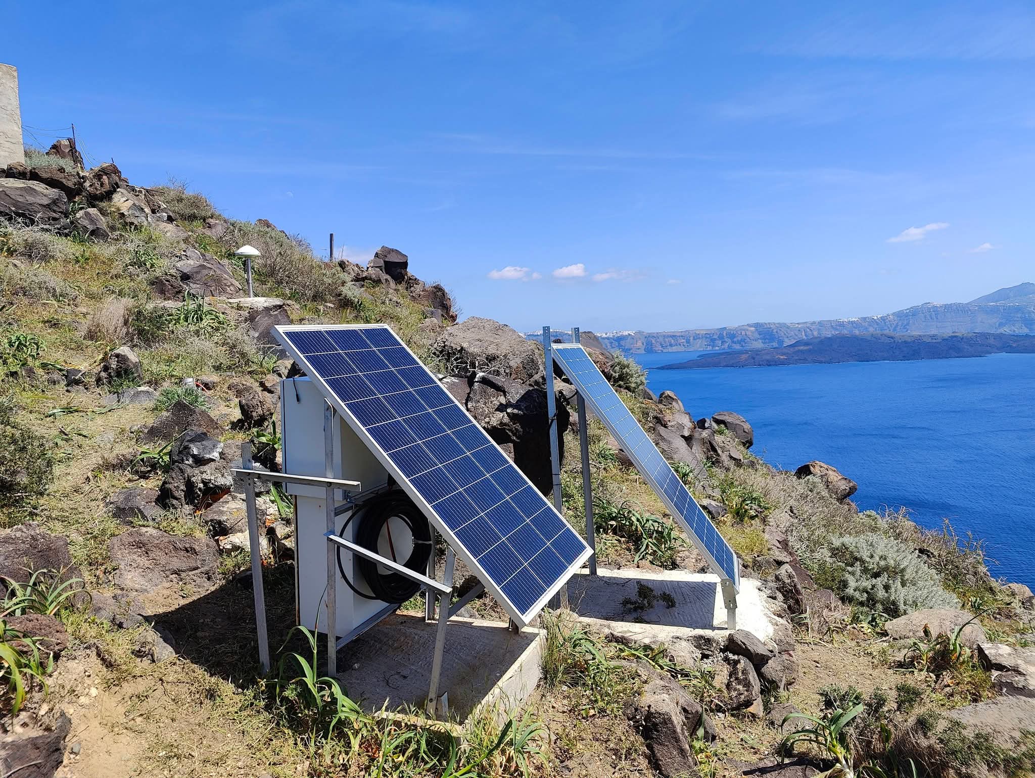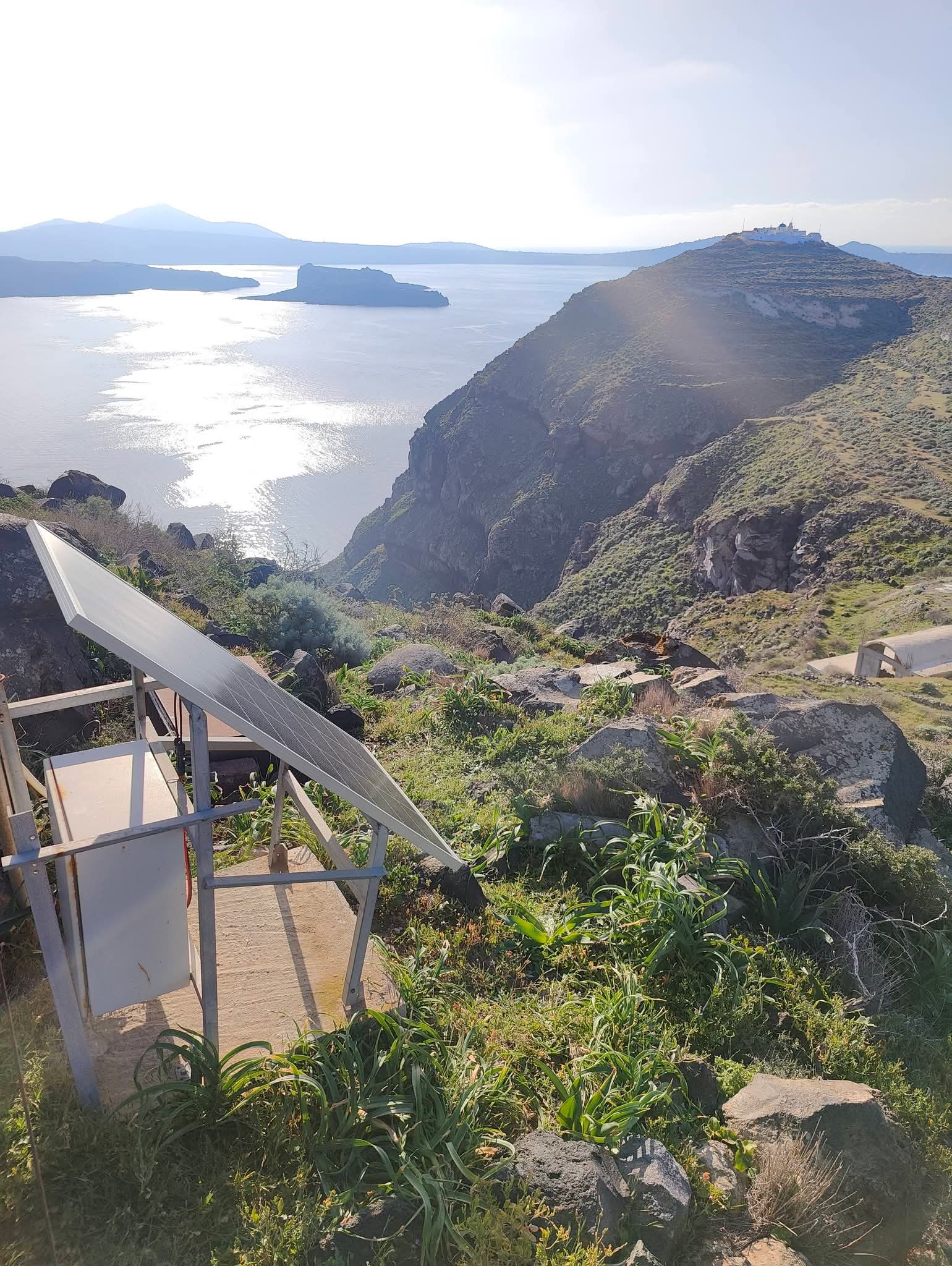 Καλώδια, φωτοβολταϊκά πάνελ και τοπογραφικά όργανα που μοιάζουν με τηλεσκόπια και μετρούν γωνίες και αποστάσεις «αγκαλιάζουν» την καλντέρα, γίνονται ένα με το ηφαιστειακό τοπίο και προσπαθούν να καταγράψουν οτιδήποτε θα μπορούσε να προμηνύει ένα νέο φαινόμενο.