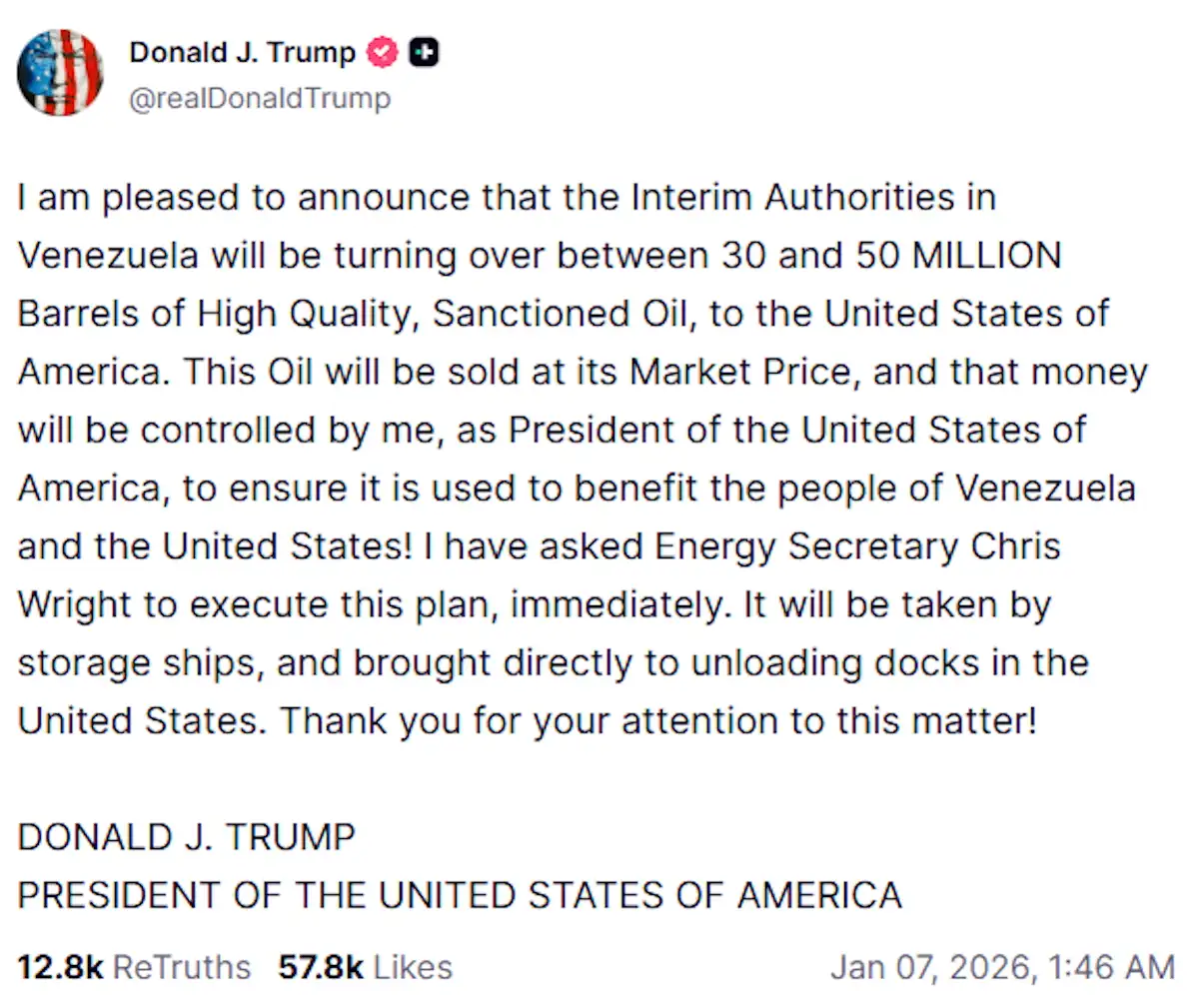 «Είμαι στην ευχάριστη θέση να ανακοινώσω ότι οι προσωρινές αρχές της Βενεζουέλας θα παραδώσουν στις Ηνωμένες Πολιτείες από 30 έως 50 εκατομμύρια βαρέλια πετρελαίου που υπόκειται σε κυρώσεις και είναι υψηλής ποιότητας», ανακοίνωσε ο Ντόναλντ Τραμπ εξηγώντας ότι «αυτό το πετρέλαιο θα πωληθεί στις τιμές της αγοράς», δηλαδή έναντι άνω των 2 δισεκατομμυρίων δολαρίων, σύμφωνα με τις σημερινές τιμές.
