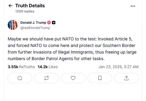Η ανάρτηση αυτή έρχεται μετά τη συνάντηση του Τραμπ με τον γενικό γραμματέα του ΝΑΤΟ, Μαρκ Ρούτε, στο περιθώριο του Παγκόσμιου Οικονομικού Φόρουμ στο Νταβός, όπου ο Ρούτε διαβεβαίωσε τον Αμερικανό πρόεδρο ότι οι Ευρωπαίοι σύμμαχοι «θα είναι στο πλευρό» των ΗΠΑ σε περίπτωση επίθεσης. Ο Ρούτε τόνισε χαρακτηριστικά ότι η συλλογική άμυνα της Συμμαχίας αποτελεί «απόλυτη εγγύηση» και παρέθεσε το παράδειγμα της επέμβασης στο Αφγανιστάν μετά τις επιθέσεις της 11ης Σεπτεμβρίου 2001.