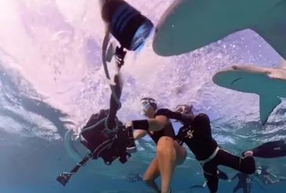 Λίγα λεπτά μετά την πρώτη τους κατάδυσης, μια ομάδα καρχαριών των Γκαλαπάγκος, γνωστών και ως φαλαινοθηρών γκρίζων υφάλων, όρμησαν πάνω σε μια γυναίκα που κρατούσε την κινηματογραφική κάμερα εξοπλισμένη με λαμπερά φώτα.