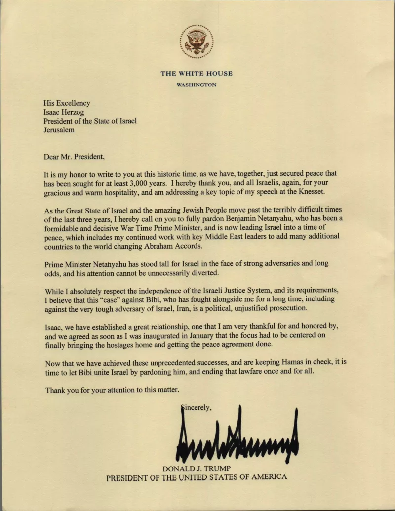 Κατά την πρόσφατη επίσκεψή του στο Ισραήλ, ο Τραμπ κατά την ομιλία του ενώπιον της Κνεσέτ είχε ζητήσει από τον Ισαάκ Χέρτσογκ να δώσει χάρη στον Νετανιάχου.