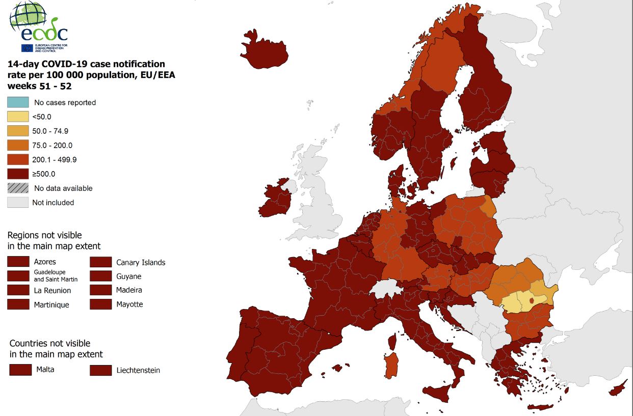 Στο μάτι του κυκλώνα βρίσκεται η Ελλάδα αλλά και ολόκληρη η Ευρώπη, λόγω της μετάλλαξης Όμικρον, ο οποίος σύμφωνα με τον χάρτη του ECDC, επικρατεί παντού.