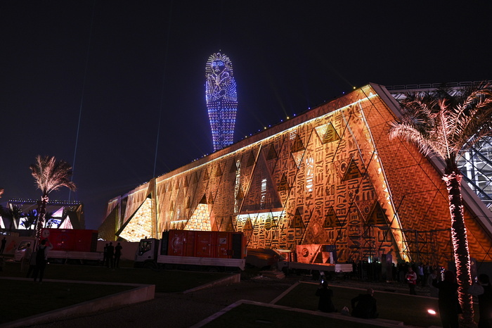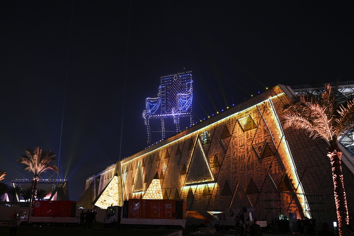 Προοίμιο του θεάματος των εγκαινίων, η μνημειώδης πρόσοψη του μουσείου, με την πανοραμική θέα στο οροπέδιο της Γκίζας και τις πυραμίδες της, που φωταγωγείται τις τελευταίες νύχτες. Το πρωί του Σαββάτου (1/11/25), ισχυρή ομάδα ασφαλείας αναπτύχθηκε γύρω από το μουσείο και τεράστιες αιγυπτιακές σημαίες υψώθηκαν σε μια γέφυρα με θέα τον κεντρικό δρόμο, σύμφωνα με τον ανταποκριτή του Γαλλικού Πρακτορείου.