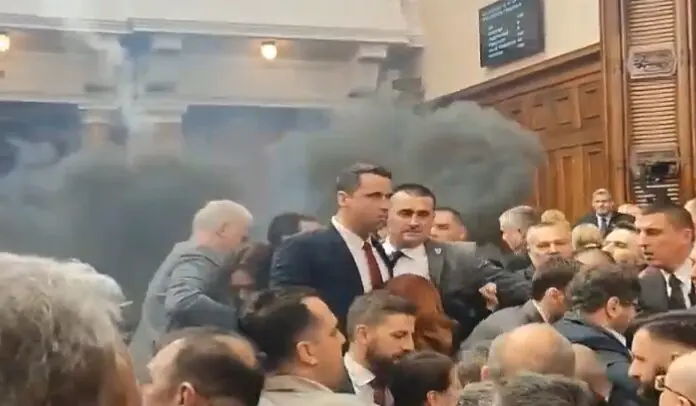 🇷🇸 Chaos in the Serbian Parliament, flares, smoke bombs, egg throwing pic.twitter.com/1nQlo40l0C