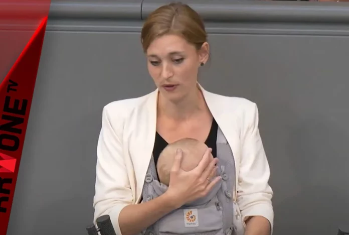 Η βουλευτής των Πρασίνων στην Ομοσπονδιακή Βουλή της Γερμανίας, Χάνα Στάινμουλερ, εκφώνησε ομιλία στη Βουλή για τον προϋπολογισμό του Υπουργείου Κατασκευών με το μωρό της στην αγκαλιά της.