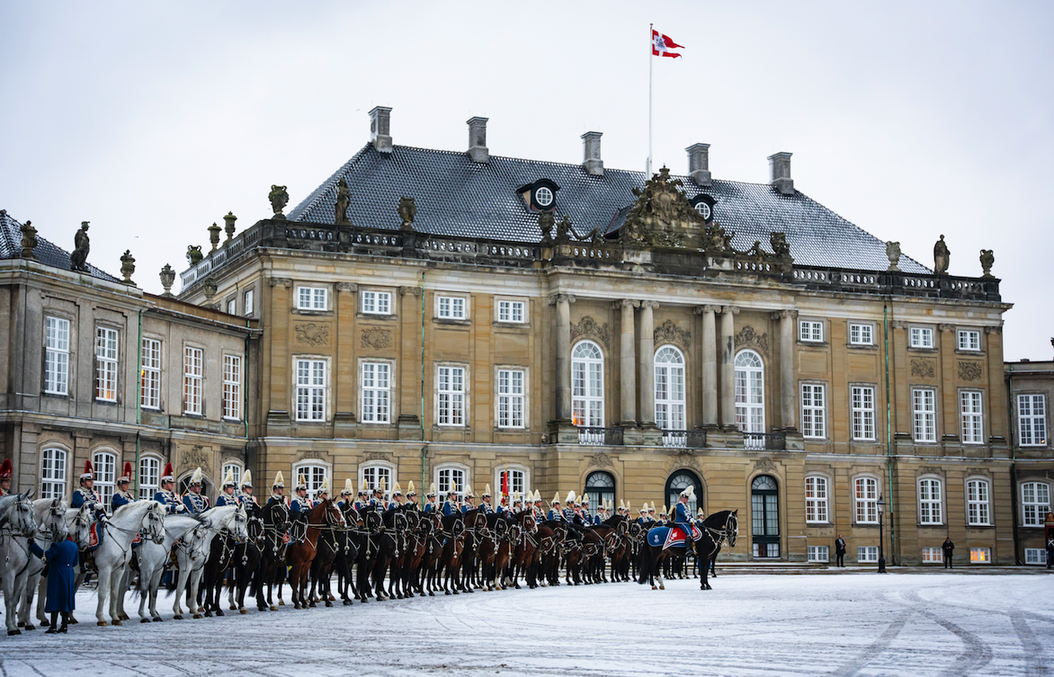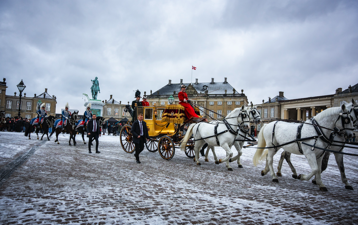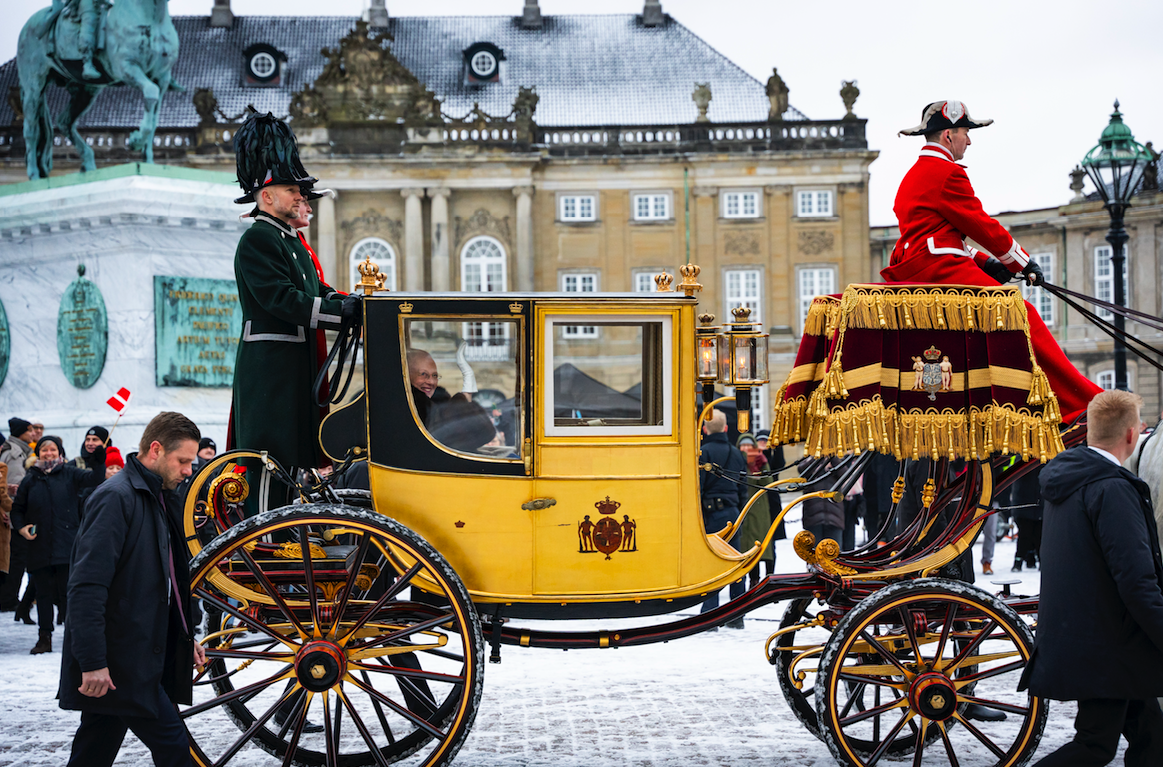 Η βασίλισσα έκανε τη διαδρομή από την κατοικία της στο Ανάκτορο Αμαλίενμποργκ κοντά στην προκυμαία μέχρι το κοινοβούλιο για μια παραδοσιακή πρωτοχρονιάτικη δεξίωση επιβαίνοντας σε μια άμαξα κατασκευασμένη το 1840 για τον Χριστιανό Η’ από τον αμαξοποιό Χένρι Φάιφ και καλυμμένη με φύλλα χρυσού 24 καρατίων.
